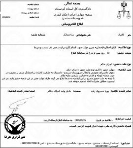 در این احضاریه که توسط شعبه چهارم اجرای احکام دادسرای عمومی و انقلاب سنندج صادر و روز چهارشنبه ۲۶ آذر، از طریق سامانه ثنا به وی ابلاغ شده، از آقای ساختمانگر خواسته شده که ظرف مدت ده روز جهت اجرای حکم حبس در این شعبه حاضر شود.