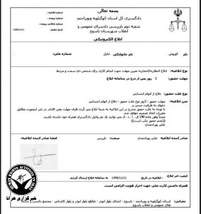در این احضاریه از این شهروند خواسته شده ظرف مدت ۵ روز از زمان درج این ابلاغیه در سامانه ثنا جهت دفاع از اتهام انتسابی در این شعبه حاضر شود.