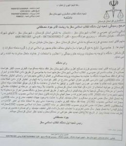 بر اساس این گزارش، رأی صادره علیه این شهروند حضوری بوده و ظرف مدت بیست روز از تاریخ ابلاغ قابل تجدیدنظر خواهی در محاکم تجدیدنظر سنندج است.