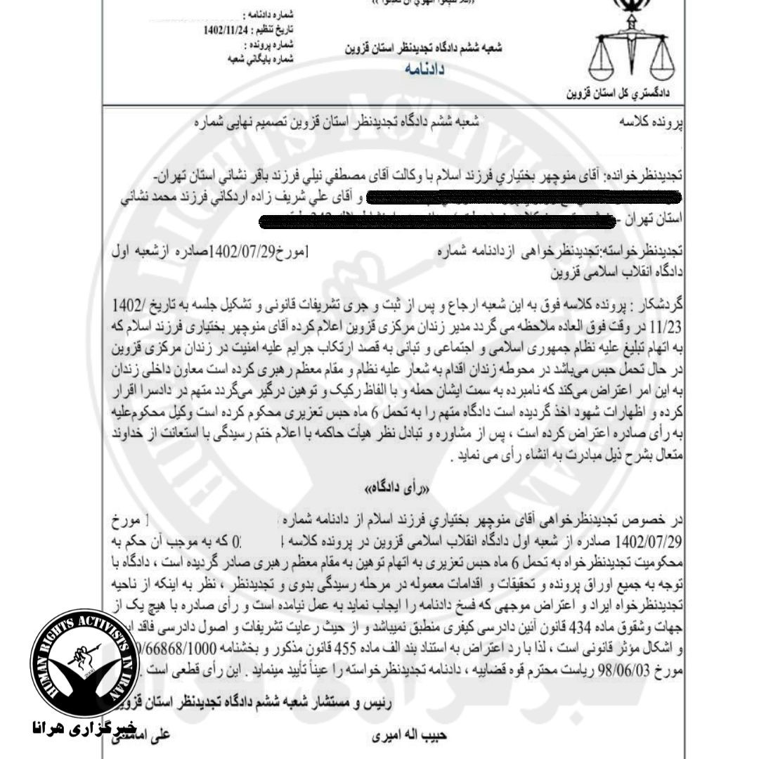 حکم شش ماه حبس منوچهر بختیاری، زندانی سیاسی محبوس در زندان قزوین، توسط شعبه ششم دادگاه تجدیدنظر استان قزوین عینا تایید شد.